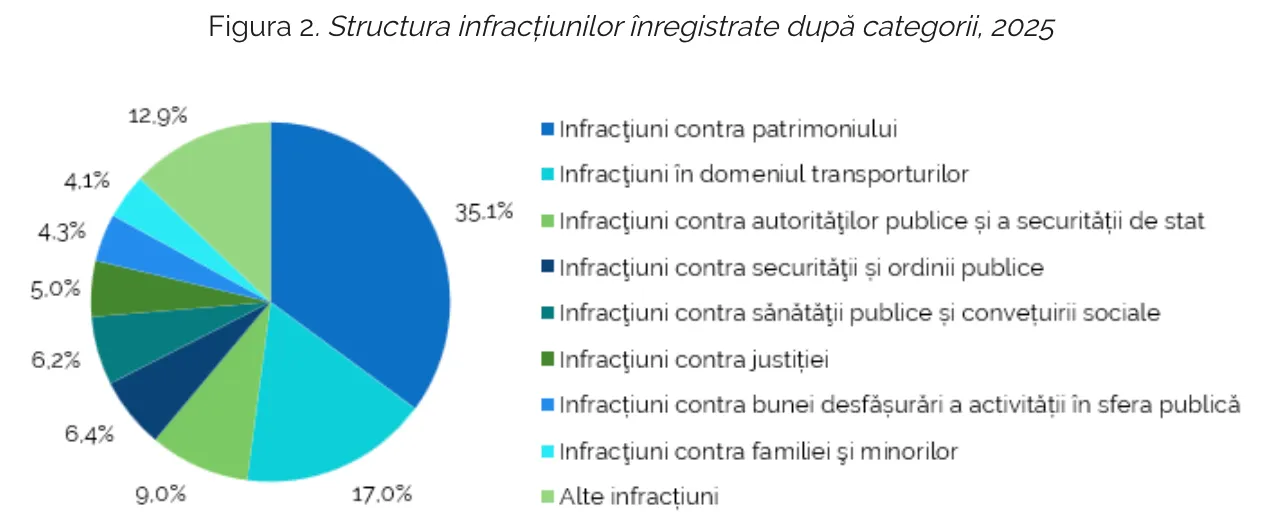 Mai mult de o treime dintre infracțiuni au vizat patrimoniul (35,1%), iar 17% au fost în domeniul transporturilor. Infracțiunile contra autorităților publice și securității de stat au reprezentat 9%, iar cele contra securității și ordinii publice – 6,4%.