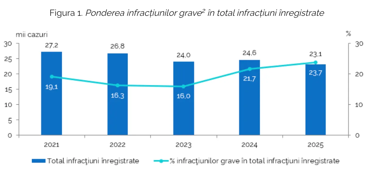 Circa 23,7% din totalul infracțiunilor au fost excepțional de grave, deosebit de grave sau grave. Dintre acestea, 3,3% au fost încadrate drept excepțional de grave și deosebit de grave, iar 20,4% – infracțiuni grave, transmite Știri.md.
