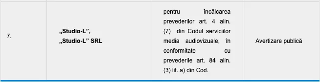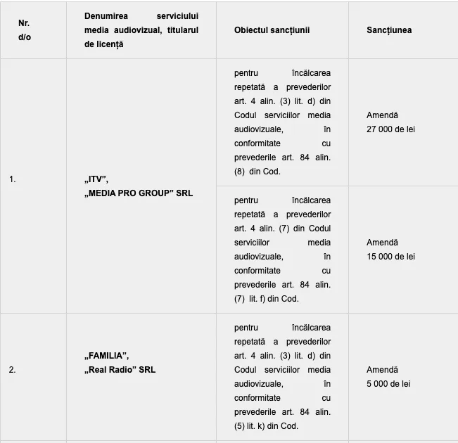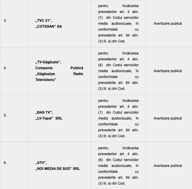 Menționăm că „MEDIA PRO GROUP” SRL, „Real Radio” SRL, „COTIDIAN” SA, Compania Publică „Găgăuziya Radio Televizionu”, „LV-Topal” SRL, „NOI MEDIA DE SUD” SRL și „Studio-L” SRL sunt obligate să difuzeze textul sancțiunii în următoarele 48 de ore de la data adoptării deciziei privind aplicarea sancțiunii, sonor și/sau vizual, de cel puțin 3 ori, în orele de maximă audiență, din care o dată în principalul program audiovizual de știri, în cazul serviciilor media audiovizuale generaliste și/sau de știri.