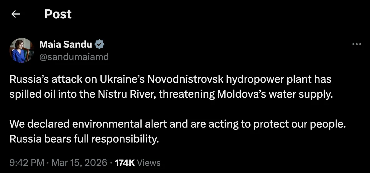 „Atacul Rusiei asupra hidrocentralei ucrainene de la Novodnestrovsk a deversat petrol în râul Nistru, amenințând alimentarea cu apă a Moldovei. Am declarat alertă ecologică și acționăm pentru a ne proteja poporul. Rusia poartă întreaga responsabilitate”, a scris președintele.