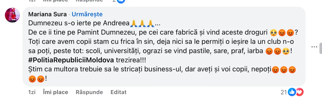 În context, mama îndurerată îndeamnă și pe alți părinți să discute cu copii lor despre riscurile substanțelor interzise: „Vă rog din suflet: vorbiți cu copiii voștri. Avertizați-i despre acest pericol. Spuneți-le să fie atenți la ce beau, cu cine ies, în ce anturaj se află. Spuneți-le să nu accepte nimic de la necunoscuți și să aibă curaj să spună „nu””.