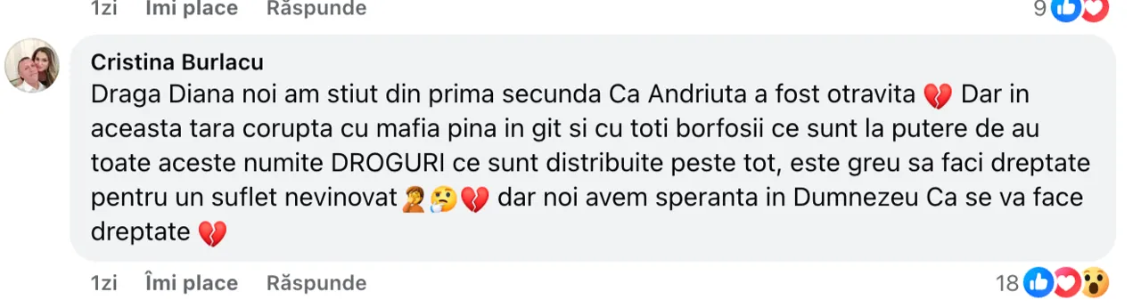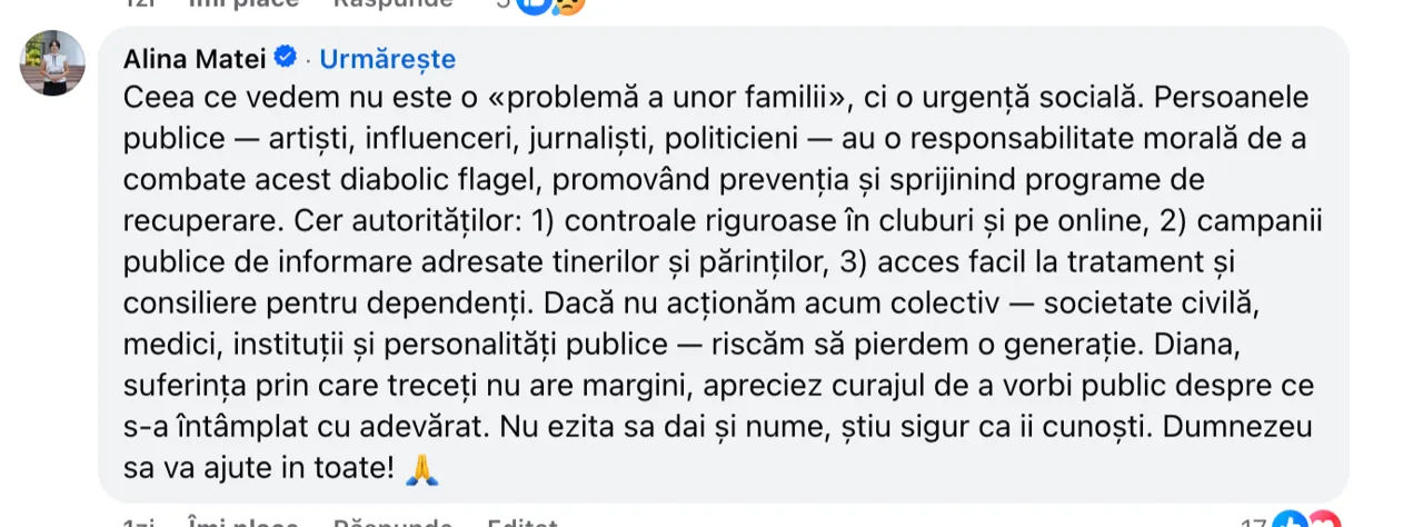 Într-un mesaj publicat pe rețelele sociale, Diana Cuciuc îndeamnă părinții să-și ocrotească copii și să-i ferească de droguri. Femeia confirmă că fiica sa, Andreea, ar fi decedat din cauza substanțelor interzise adăugate în paharul ei.