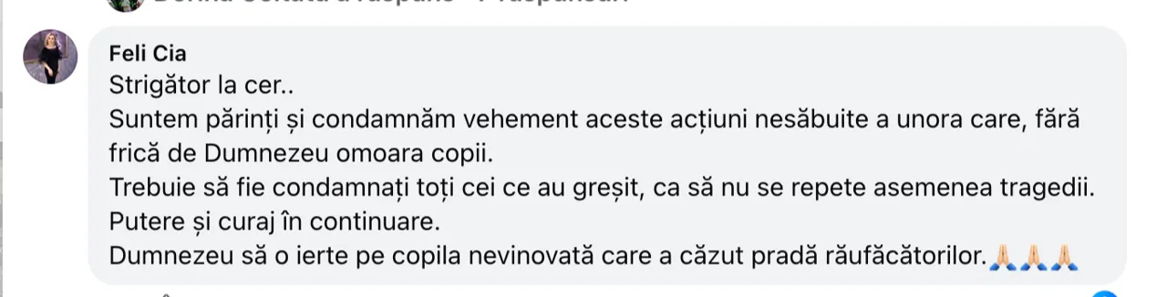„Noi, părinții, nu putem fi mereu lângă ei, dar putem să le lăsăm în suflet vocea noastră, care să-i oprească în clipa pericolului.Să nu mai moară niciun copil din Moldova din cauza nepăsării sau a răului ascuns în jurul lor. Să fim uniți, să ne ocrotim copiii și să nu lăsăm această tragedie să se mai repete”, a conchis femeia.