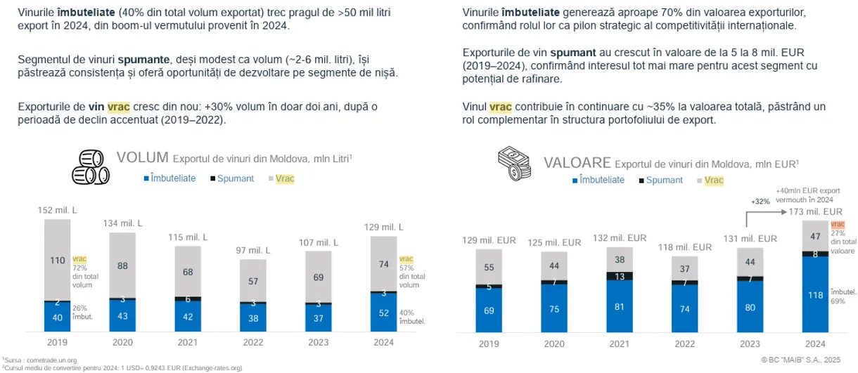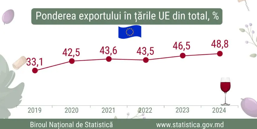 Potrivit datelor Biroului Național de Statistică (BNS), 48,8% din vinurile moldovenești exportate în 2024 au ajuns pe piața UE. Anul 2024 a marcat un record istoric pentru exporturile de vinuri moldovenești, care au depășit 235 de milioane de dolari (echivalentul a aproximativ 4 miliarde de lei), fiind livrate în peste 70 de țări.