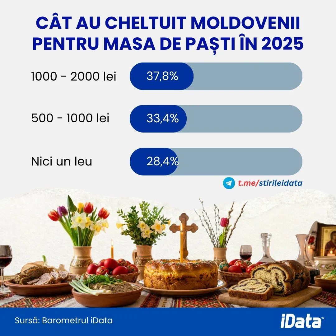 Majoritatea moldovenilor au cheltuit între 500 și 2.000 de lei pentru masa de Paște în 2025, în timp ce costurile pentru produsele de bază în 2026 indică un coș minim de aproximativ 800 de lei.