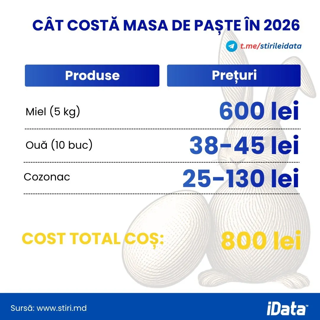 În ceea ce privește anul 2026, estimările pentru produsele de bază indică prețuri de aproximativ 600 de lei pentru cinci kg de miel, între 38 și 45 de lei pentru zece ouă și între 25 și 130 de lei pentru cozonac. Astfel, un coș minim pentru masa de Paște ar ajunge la circa 800 de lei.