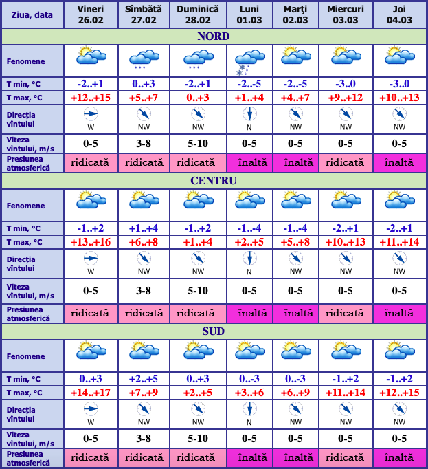 Meteorologii prognozează pentru ziua de astăzi, 26 februarie, cer variabil în toată țara. Temperaturile vor oscila între +12 şi +17 grade Celsius, ziua, iar noaptea între 0 și -2 grade Celsius.
