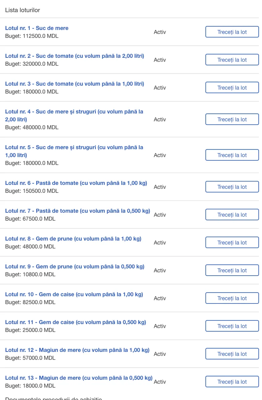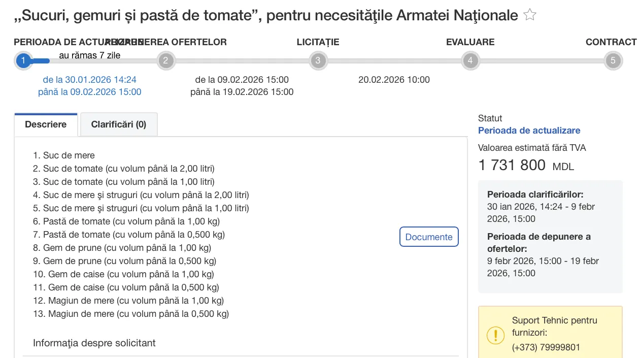 Cel mai mare lot constituie sucul de mere cu volum de doi litri. Pentru acest produs, Armata Națională urmează să cheltuie până la 480.000 de lei.