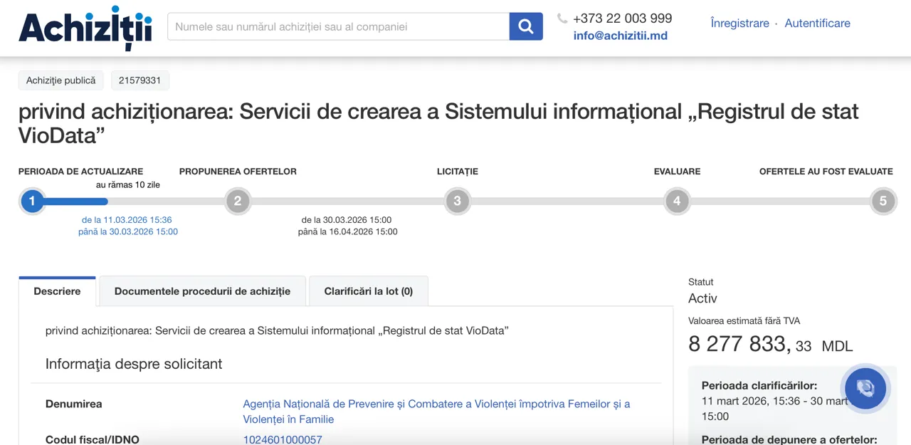 Republica Moldova ar putea avea, în curând, un sistem informațional unic destinat monitorizării și gestionării cazurilor de violență domestică. Autoritățile au lansat o licitație publică pentru dezvoltarea platformei „Registrul de stat VioData”, proiect estimat la aproximativ 8,3 milioane de lei.