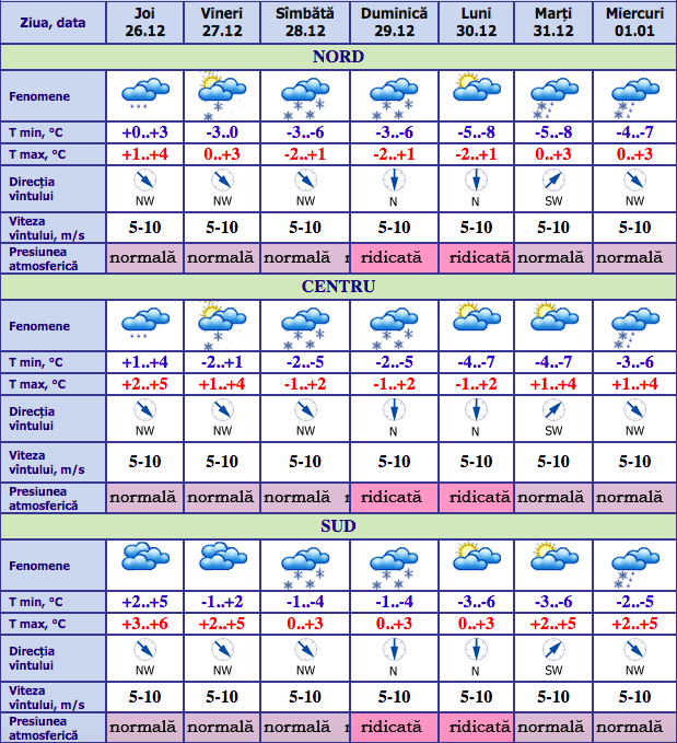 În ultimul weekend din anul 2019, în raioanele de nord, valorile termice vor arăta -3...-6 grade la noapte și -2... +1 grade ziua.
