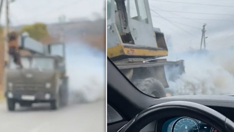 O macara veche de model MAZ a lăsat un șofer învăluit de un nor negru și dens de fum toxic.