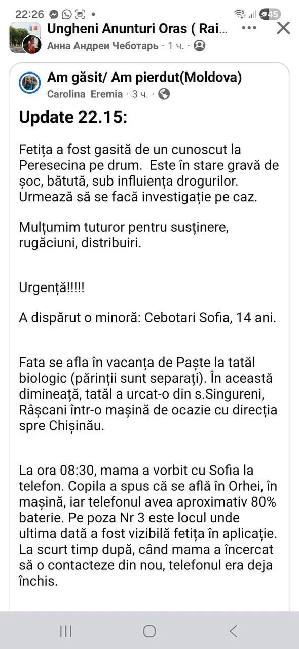 „La ora 08:30, mama a vorbit cu Sofia la telefon. Copila a spus că se află în Orhei, în mașină, iar telefonul avea aproximativ 80% baterie. La scurt timp, mama a încercat să o contacteze din nou, dar telefonul era deja închis și de atunci nu se mai știe nimic de copilă! Mama sună încontinuu la numărul ei, dar telefonul e închis”, se arată în mesajul unei internaute, publicat cu acordul mamei.