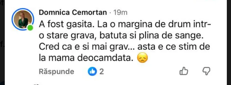 Foto: ziar.md„A fost găsită. La o margine de drum într-o stare gravă, bătută și plină de sânge. Cred că e și mai grav”, a scris o internaută citând-o pe mama tinerei, transmite Știri.md.