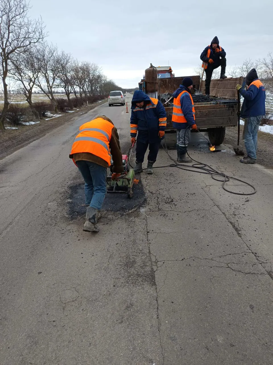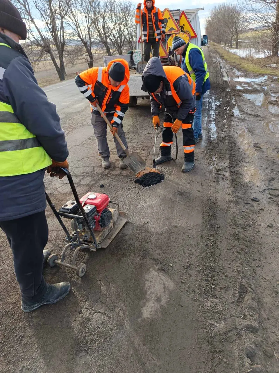 Drumarii desfășoară lucrări de plombare cu mixtură asfaltică la rece pe mai multe drumuri afectate de gropi, intervenții temporare necesare în această perioadă pentru menținerea circulației în condiții de siguranță.