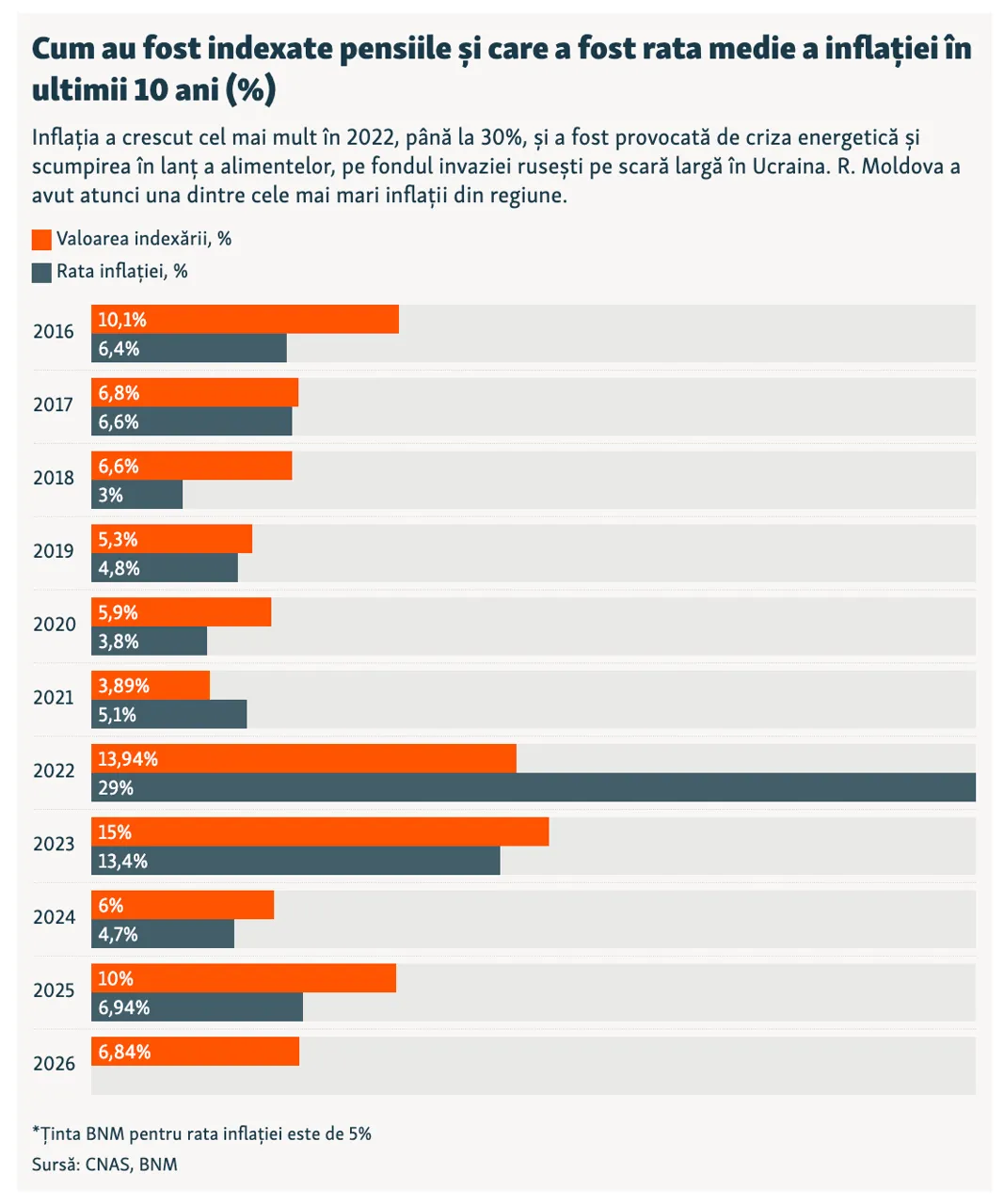 - 2022 - 13,94%, inflație de 29% (an cu inflație record, generată de criza energetică și războiul din Ucraina);
