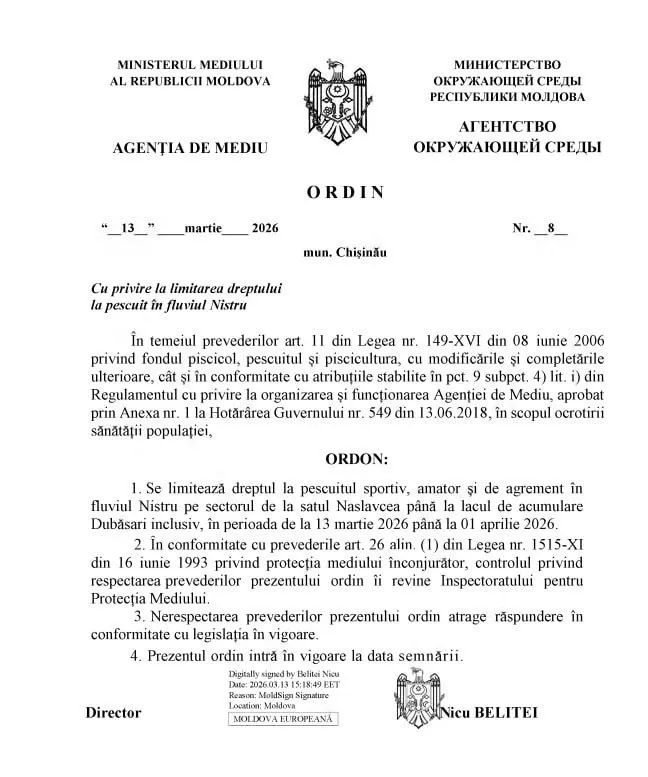 Conform ordinului, dreptul la pescuit sportiv, amator și de agrement este limitat pe sectorul menționat al Nistrului pe toată durata restricției.