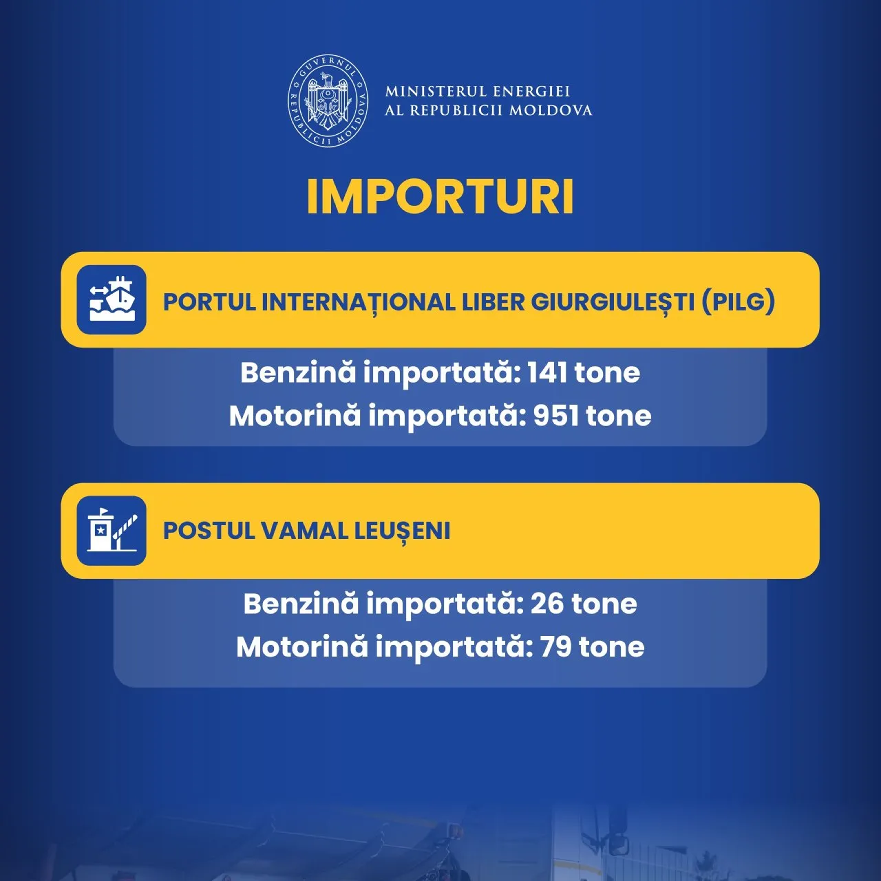 Imagine simbolMai exact, prin intermediul Portului Internațional Liber Giurgiulești au fost aduse 141 de tone de benzină și 951 de tone de motorină, iar prin postul vamal Leușeni - circa 26 de tone de benzină și 79 de tone de motorină, transmite Știri.md.