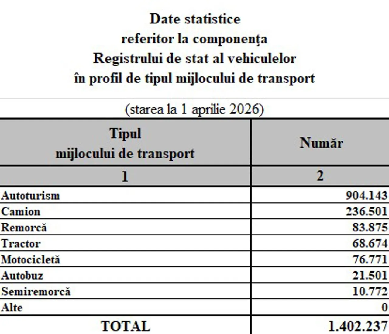Imagine simbolPotrivit datelor din Registrul de stat al vehiculelor, la 1 aprilie 2026 erau înregistrate în total 1.402.237 de unități, cu 78.830 mai multe decât în aceeași perioadă a anului trecut, transmite Știri.md cu referire la moldova1.md.