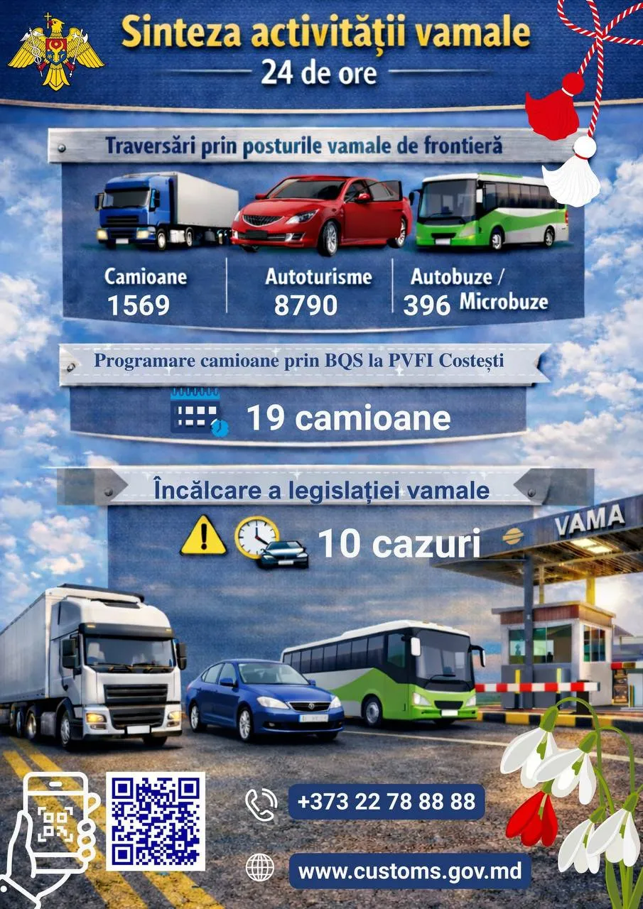 Serviciul Vamal al Republicii Moldova anunță un flux ridicat de camioane la punctele de trecere a frontierei, în perioada 28–29 martie, când peste 1.500 de unități au traversat frontiera țării.