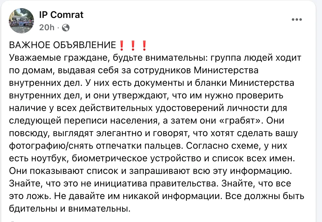 „Prezintă o listă și cer toate aceste informații. Aceasta nu este o inițiativă guvernamentală, ci minciună, Nu le oferiți informații. Toți trebuie să fie vigilenți și atenți”, se arată în comunicatul Inspectoratului de Poliție Comrat.