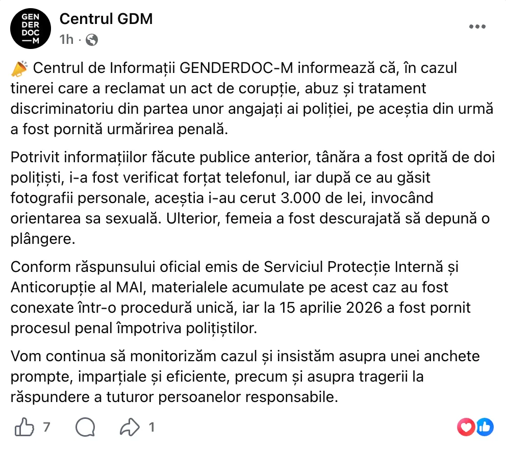 Centrul Genderdoc-M anunță că a fost inițiat un proces penal pe numele celor doi polițiști acuzați că ar fi oprit o tânără pe stradă, i-ar fi verificat telefonul fără consimțământ și i-ar fi cerut bani, invocând orientarea sa sexuală.