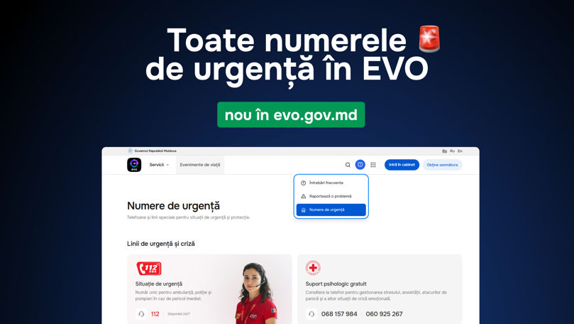 Portalul guvernamental integrat EVO a fost completat cu o nouă secțiune dedicată numerelor de urgență și liniilor specializate de suport, astfel încât cetățenii să poată accesa rapid informațiile esențiale, fără a naviga pe mai multe site-uri.