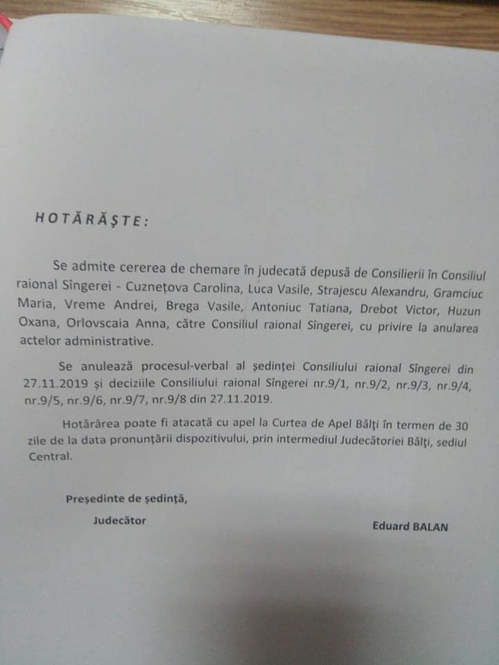 „După această notificare, 11 consilieri raionali au contestat în instanța de judecată și există decizia Judecătoriei Bălți prin care s-a dat câștig de cauză și s-a constat că președintele raionului și vicepeședinții au fost aleși ilegal în funcții.