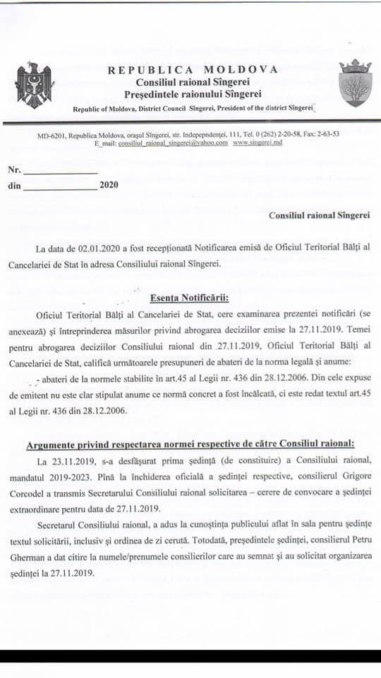 Conform acestei notificări, Cancelaria de Stat a constatat anterior încălcarea legislației la alegerea lui Grigore Corcodel în funcția de președinte de raion, precum și a lui Ion Bîrsanu, Iulian Eremei și Tudor Tutunaru în funcția de vicepreședinți.