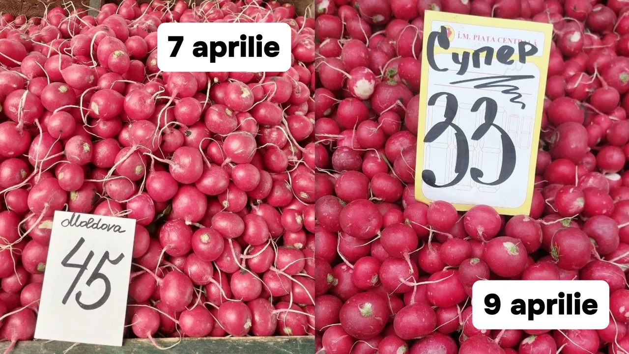 Pe de altă parte, unele produse s-au ieftinit. Ridichea a scăzut de la 45 la 33 de lei/kg, iar bostăneii s-au ieftinit ușor, de la 40 la 38 de lei/kg. Strugurii au coborât și ei în preț, de la 20 la 15 lei/kg.