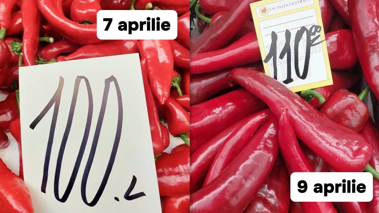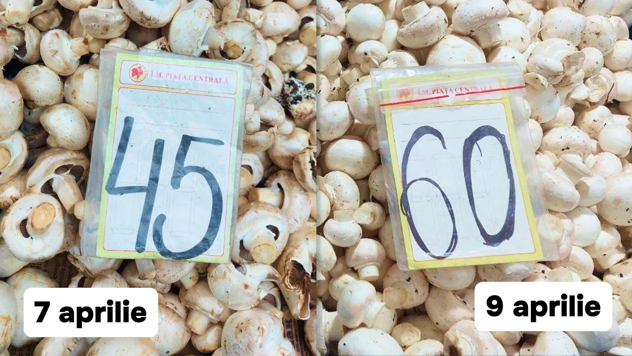 Colaj: Știri.mdComparativ cu data de 7 aprilie, mai multe produse au avut creșteri vizibile de preț până pe 9 aprilie. De exemplu, ciupercile s-au scumpit de la 45 la 60 de lei kilogramul. Și ardeii capia au înregistrat o majorare de 10 lei, ajungând la 110 lei/kg, transmite Știri.md.