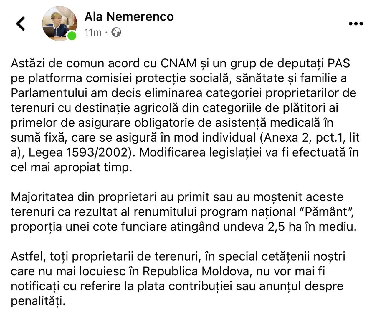 Ministrul Sănătății, Ala Nemerenco, anunță că astăzi, 15 martie, de comun acord cu CNAM și un grup de deputați din Parlament, a decis eliminarea categoriei proprietarilor de terenuri cu destinație agricolă din categoriile de plătitori ai primelor de asigurare obligatorie de asistență medicală în sumă fixă, care se asigură în mod individual.
