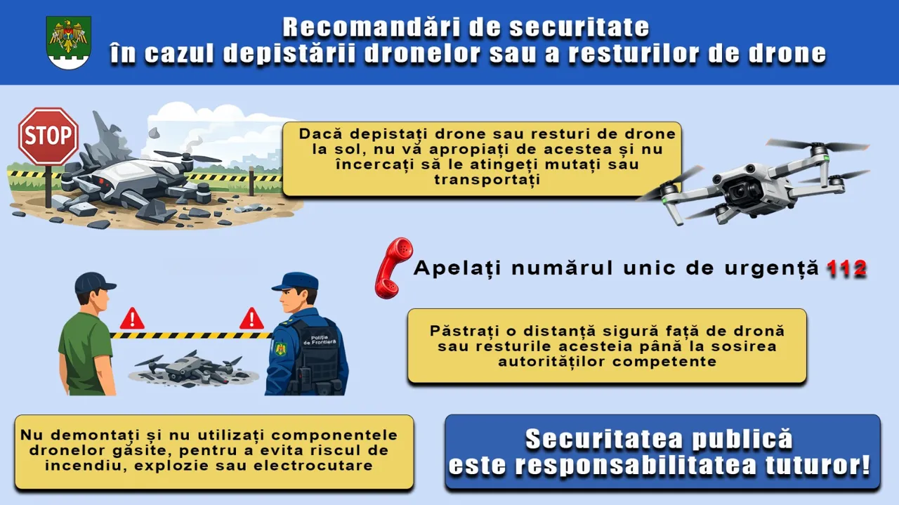 „Dronele sau resturile acestora pot conține substanțe explozive, elemente electrice ori baterii periculoase, care pot provoca accidente grave. Dacă observați o dronă în zbor, nu încercați să o interceptați sau să o distrugeți. Apelați imediat 112. Securitatea publică este responsabilitatea tuturor. Respectarea acestor recomandări contribuie la protejarea vieții, sănătății și bunurilor fiecărui cetățean”, au declarat autoritățile.