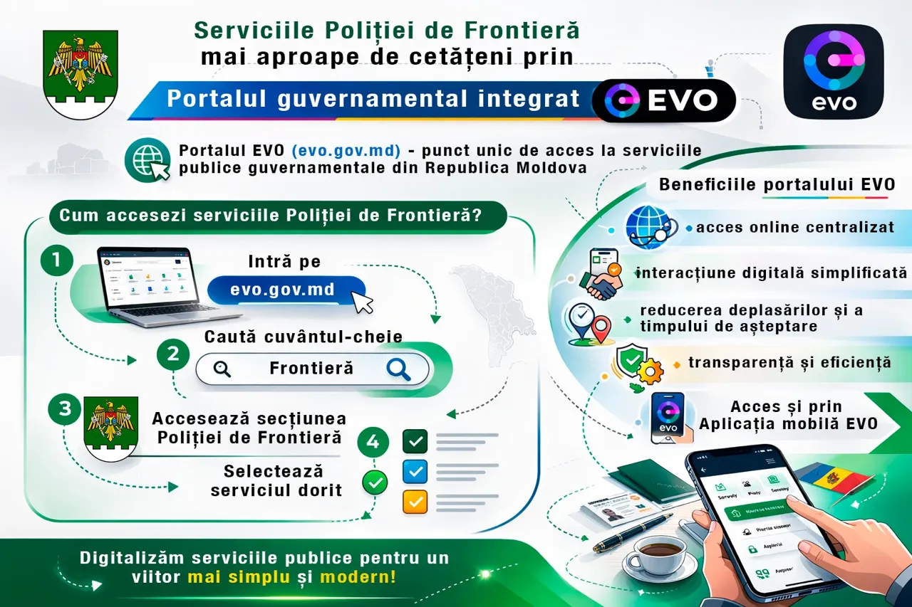 Poliția de Frontieră anunță integrarea serviciilor sale în Portalul guvernamental integrat EVO, platformă digitală lansată în luna ianuarie, care funcționează ca punct unic de acces la serviciile publice din Republica Moldova.