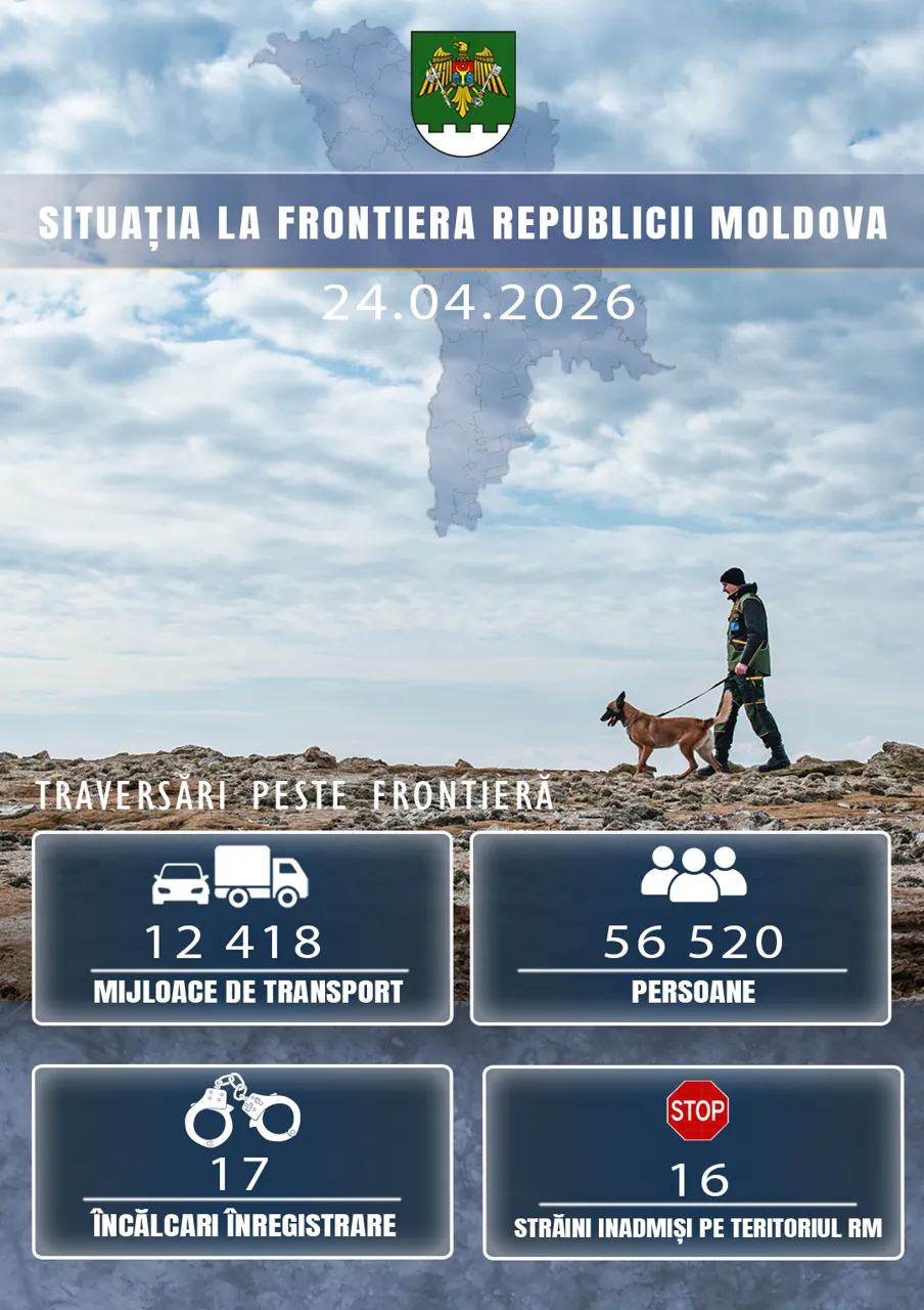 Inspectoratul General al Poliției de Frontieră anunță că, în ultimele 24 de ore, fluxul de persoane la frontiera de stat a constituit 56.520 de traversări, iar cel al mijloacelor de transport – 12.418 traversări.