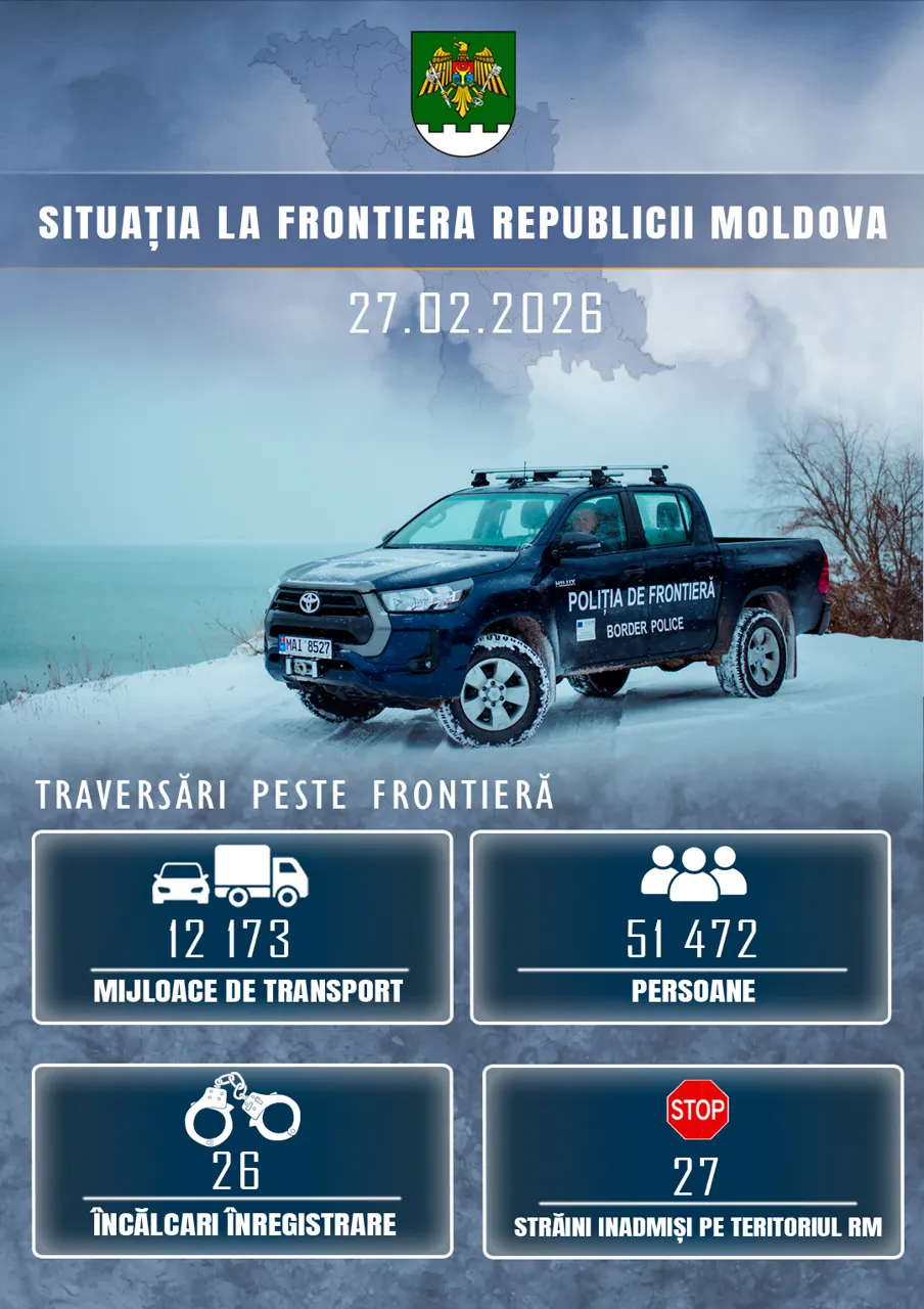 În ultimele 24 de ore, prin punctele de trecere a frontierei au fost înregistrate 51.472 de traversări ale persoanelor și 12.173 de traversări ale mijloacelor de transport.