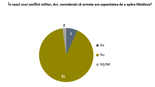 Datele mai arată că 91% din respondenți au recunoscut că, în cazul unui conflict militar, Armata Națională nu are capacitatea să apere țara noastră, în timp ce 7% sunt convinși că soldații moldoveni vor reuși să apere patria.
