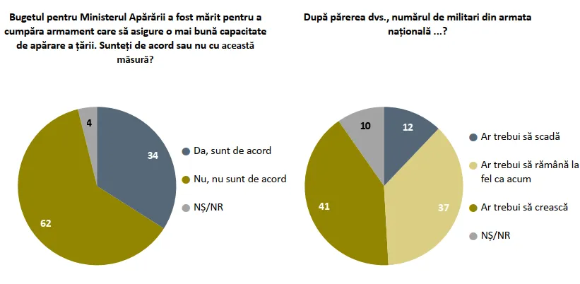 La întrebarea „Bugetul pentru Ministerul Apărării a fost mărit pentru a cumpăra armament care să asigure o mai bună capacitate de apărare a țării. Sunteți de acord sau nu cu această măsură?”, peste 60% au răspuns că nu sunt de acord cu majorarea făcută de autoritățile responsabile.