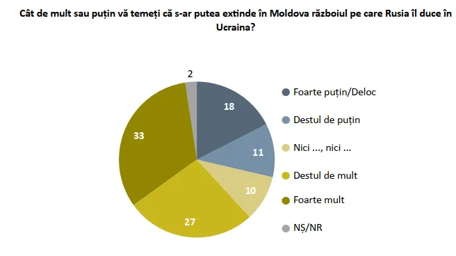 Potrivit Barometrului socio-politic februarie 2023, realizat de compania de cercetare sociologică IMAS, 60% din respondenți au recunoscut că le este teamă că războiul pe care Rusia îl duce în Ucraina s-ar putea extinde și în Republica Moldova. De cealaltă parte, 29% spun că nu cred într-un așa scenariu, transmite Știri.md cu referire la realitatea.md.