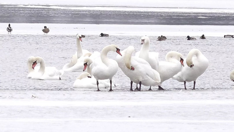 Spectacol alb pe apa rece a iernii. Zeci de lebede iernează pe Nistru, la Florești