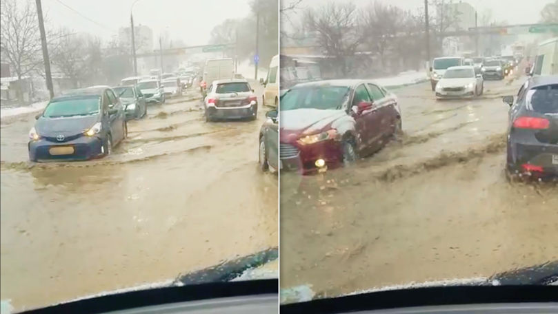 Colaj: Știri.mdEste vorba despre strada de lângă Grădina Botanică din Capitală, unde traficul a fost îngreunat din cauza apei, transmite Știri.md.