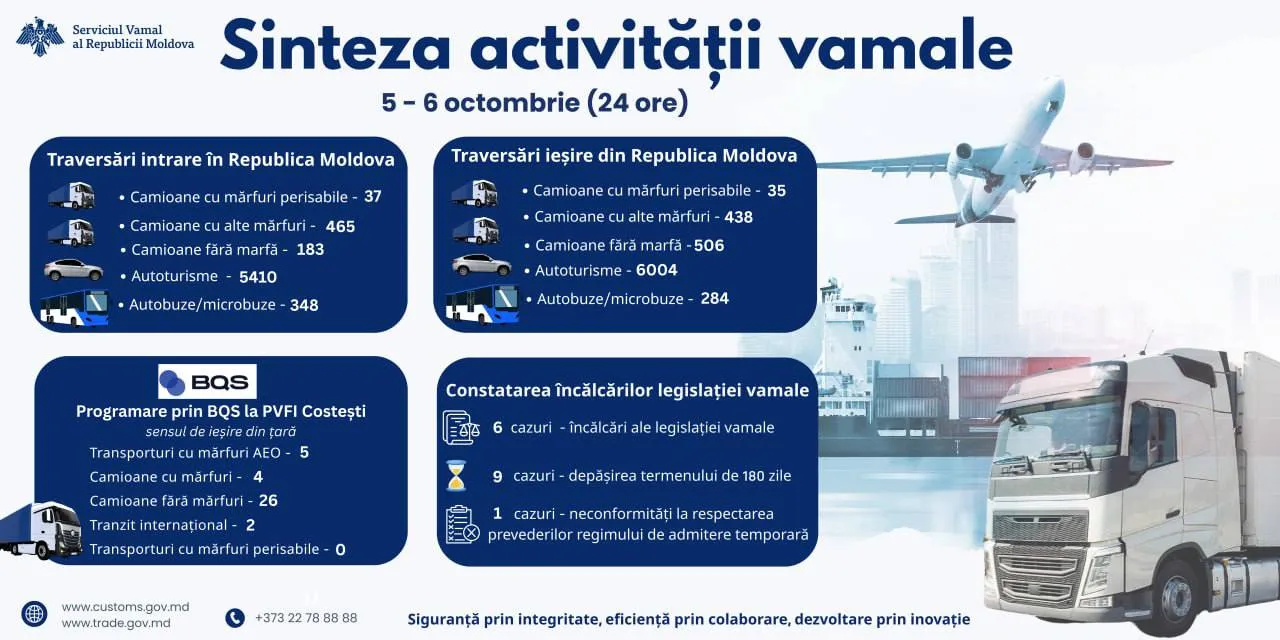 Serviciul Vamal al Republicii Moldova a prezentat sinteza activității pentru perioada 5–6 octombrie. În aceste două zile, frontiera țării a fost traversată de peste 11.000 de mijloace de transport, atât pe sensul de intrare, cât și pe cel de ieșire.