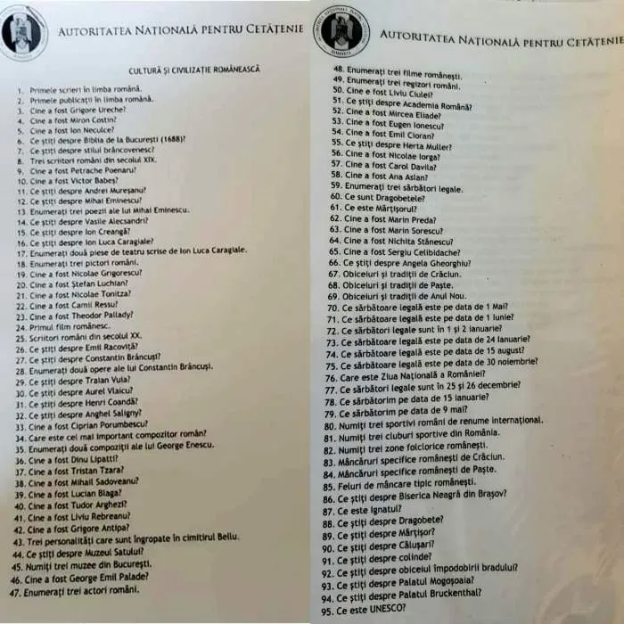 Imigranții care solicită acordarea cetățeniei române trebuie să treacă printr-un interviu care include un test considerat de mulți dificil. Procedura a revenit în atenția publică după ce, pe rețelele sociale, a fost distribuită o fotografie cu o listă de 95 de întrebări care ar fi adresate candidaților, stârnind numeroase reacții și ironii.