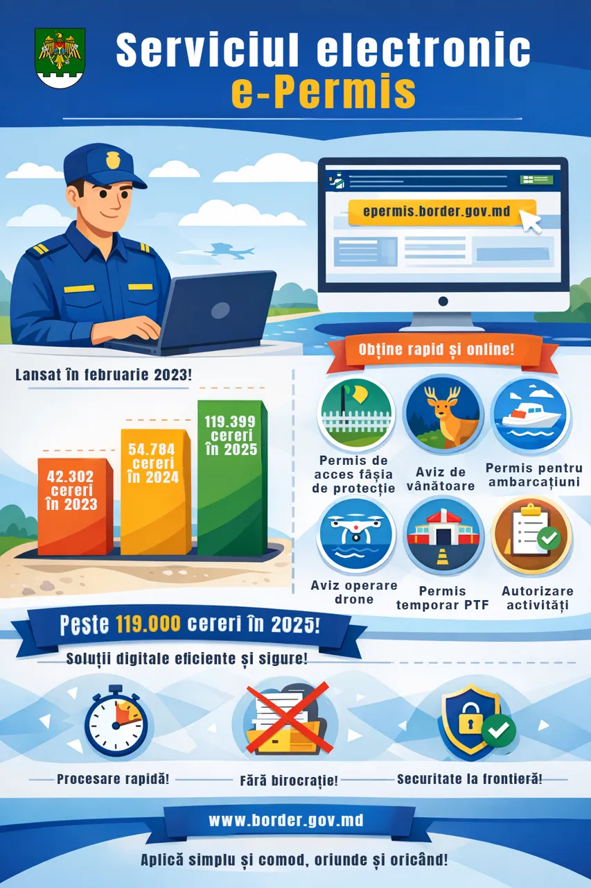 Imagine simbolNumărul cererilor procesate prin Sistemul Informațional e-Permis a înregistrat o evoluție remarcabilă. De la 42.302 cereri în anul 2023, platforma a înregistrat 119.399 cereri în anul 2025, transmite Știri.md.