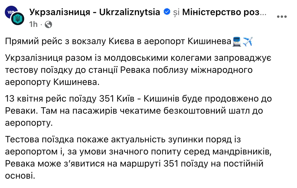 Un nou serviciu de transport ar putea facilita deplasarea pasagerilor din Kiev spre Aeroportul Internațional Chișinău. Compania ucraineană Ucrzaliznița, în colaborare cu parteneri din Republica Moldova, lansează o cursă-test care va lega cele două capitale.