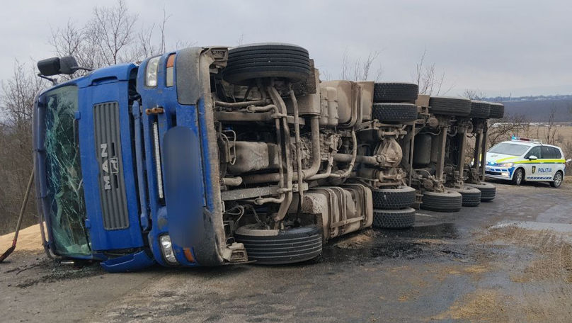 Astfel, autocamionul a derapat și s-a răsturnat pe partea carosabilă.