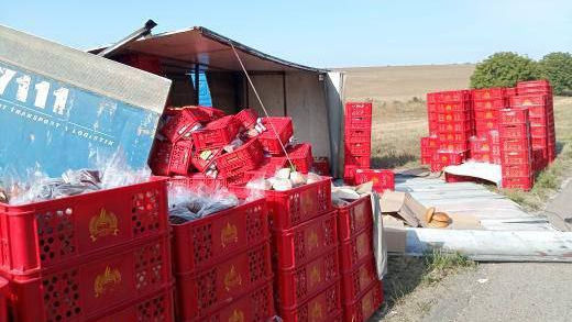 În imaginile video se vede cum camionul s-a răsturnat și din el au căzut lăzile pline cu pâine, transmite Știri.md.