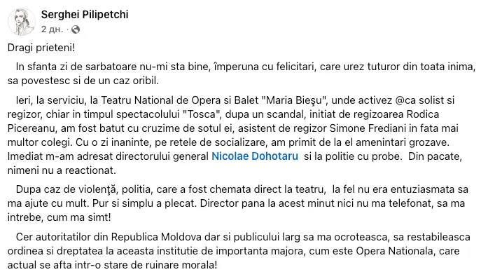 Colaj: Știri.mdPe 5 aprilie, Serghei Pilipețchi a declarat, pe o rețea socială, că pe 4 aprilie ar fi fost bătut „cu cruzime” în timpul spectacolului „Tosca”. Potrivit acestuia, incidentul ar fi avut loc după un scandal „inițiat de regizoarea Rodica Picireanu”, iar agresiunea ar fi fost comisă de Simone Frediani, soțul acesteia, în fața mai multor colegi, transmite Știri.md cu referire la newsmaker.md.