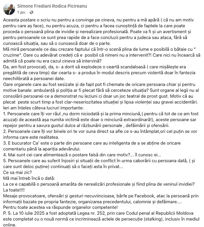 Pe 6 aprilie, Simone Frediani și Rodica Picireanu au respins acuzațiile, susținând că nu a existat nicio agresiune fizică, ci doar o ceartă.