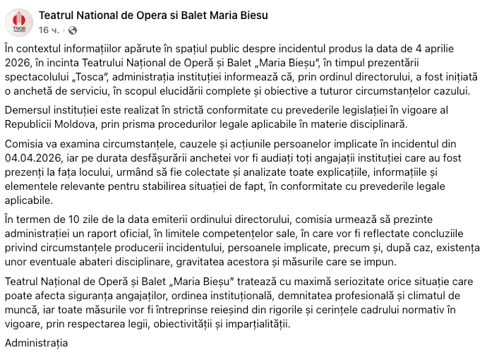 În seara zilei de 7 aprilie, administrația Teatrului Național de Operă și Balet „Maria Bieșu” a anunțat inițierea unei anchete de serviciu pentru a clarifica circumstanțele incidentului din 4 aprilie.