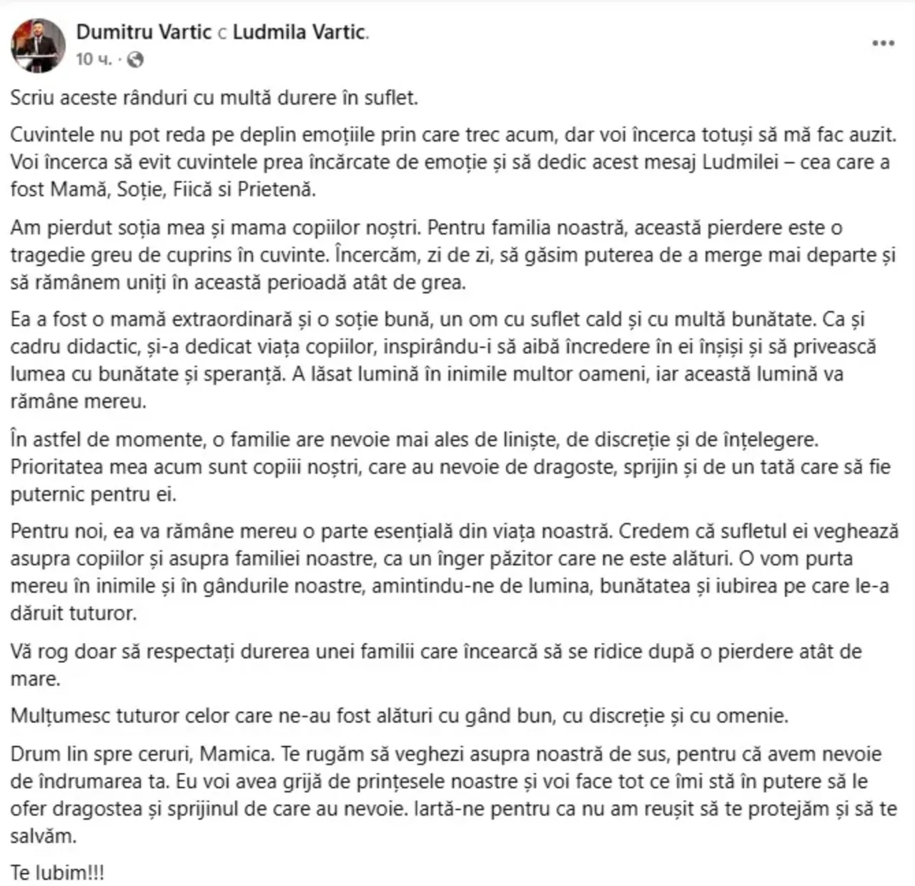 Postarea publicată anterior pe Facebook de Dumitru Vartic, în care acesta a comentat moartea soției sale, Ludmila Vartic, nu mai este pe pagina sa. Mesajul, publicat inițial după apariția informațiilor despre decesul femeii, ar fi fost șters la scurt timp.